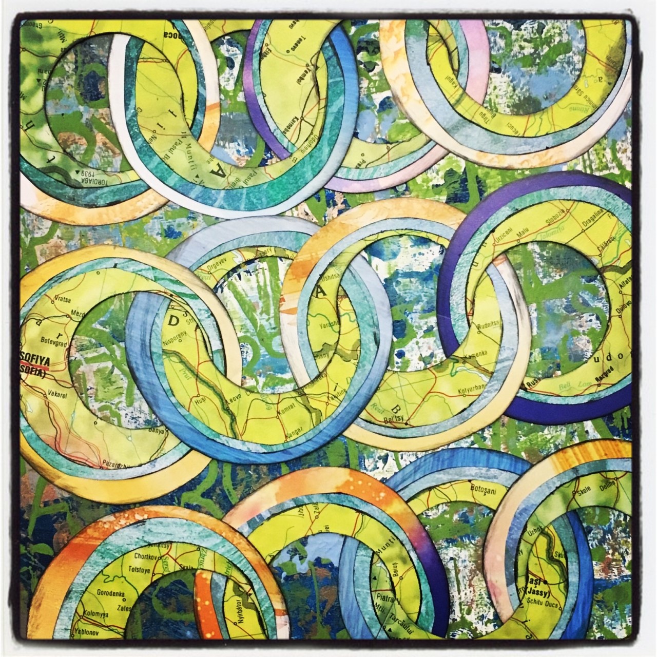 hand-cut circles (from a map and some magazines) stacked, then punched into rings, then snipped on one side so they could be linked together, then glued onto an old gel print with similar colors.